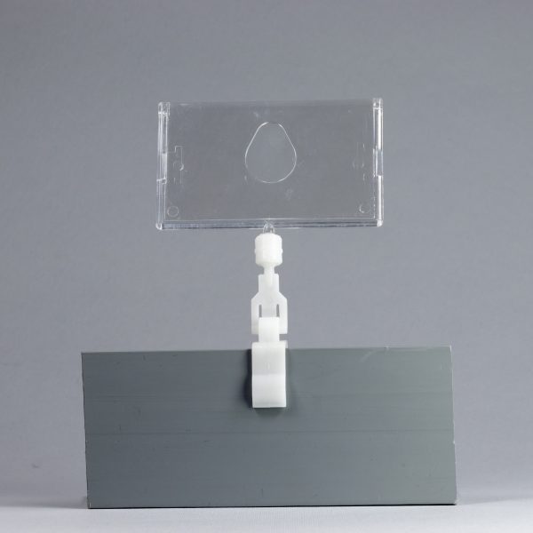 Držač za cene providni sa osloncem R malim okretnim pogodan je za kačenje na gajbe, posude, tacne i ogradice debljine od 1 do 15mm. Položaj cenovnika u odnosu na R oslonac može se podešavati okretanjem u svim pravcima.