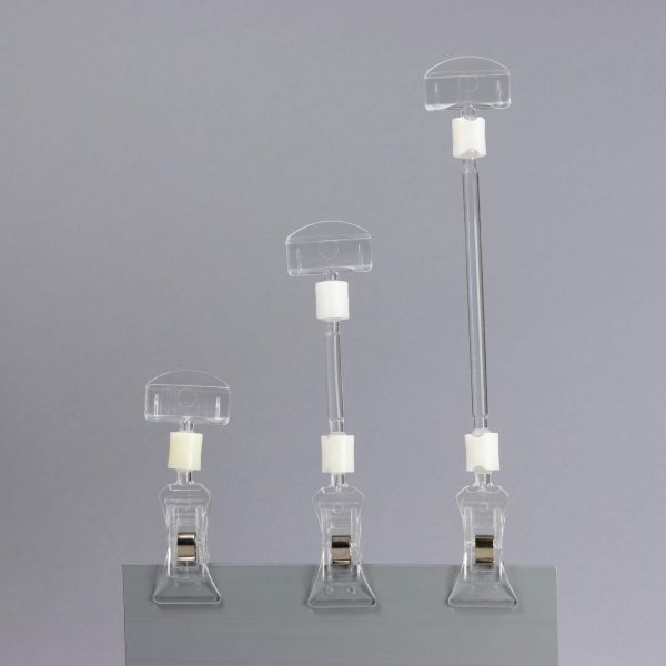 Držač za cene folija sa malom štipaljkom pogodan je za kačenje na posude, ograde i lajsne debljine od 5 do 10mm. Položaj folije u odnosu na štipaljku može se podešavati okretanjem u svim pravcima. Dimenzije prihvata za foliju su 50x10mm, što omogućuje kvalitetno držanje i većih formata folija debljine do 1mm. Zbog mogućnosti brze i lake promene natpisa, cenovnik folija pogodan je za primenu u slučajevima česte promene cena. Mala štipaljka sa distancerima od 5cm i 10cm omogućuje isticanje cena kod viših ili stepenasto slaganih proizvoda.