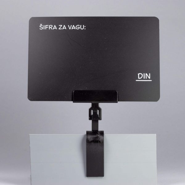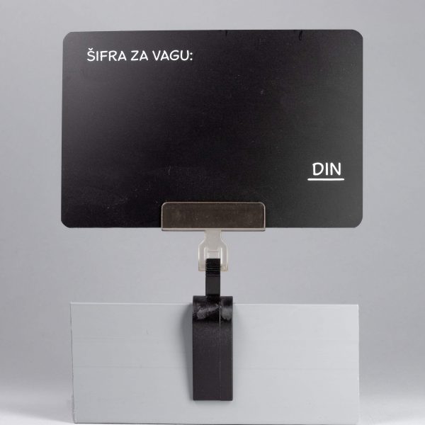 Držač za cene folija sa velikim R osloncem pogodan je za kačenje na gajbe, ograde i posude debljine od 5 do 25mm. Zglobna veza omogućuje podešavanje nagiba cenovnika, kao i postavku ispod ili iznad mesta kačenja. Dimenzije prihvata za foliju su 50x10mm, što omogućuje kvalitetno držanje i većih formata folija debljine do 1mm. Natpisi se ispisuju kreda flomasterima na vodenoj bazi, koje takođe imamo u ponudi. Zbog mogućnosti brze i lake promene natpisa, cenovnik folija pogodan je za primenu u slučajevima česte promene cena.