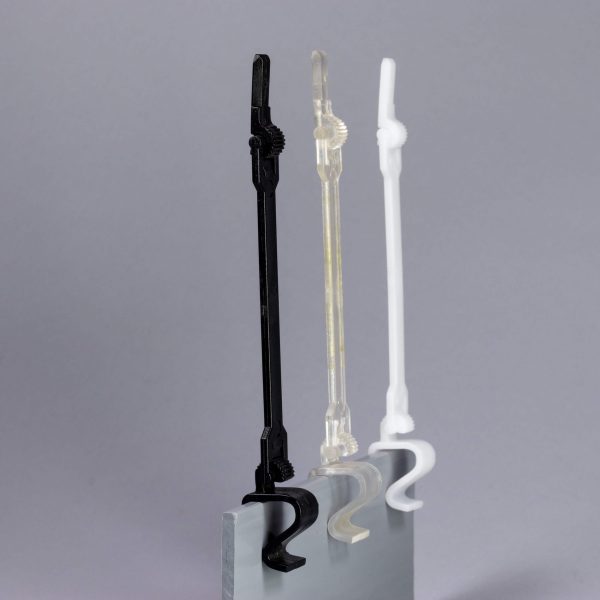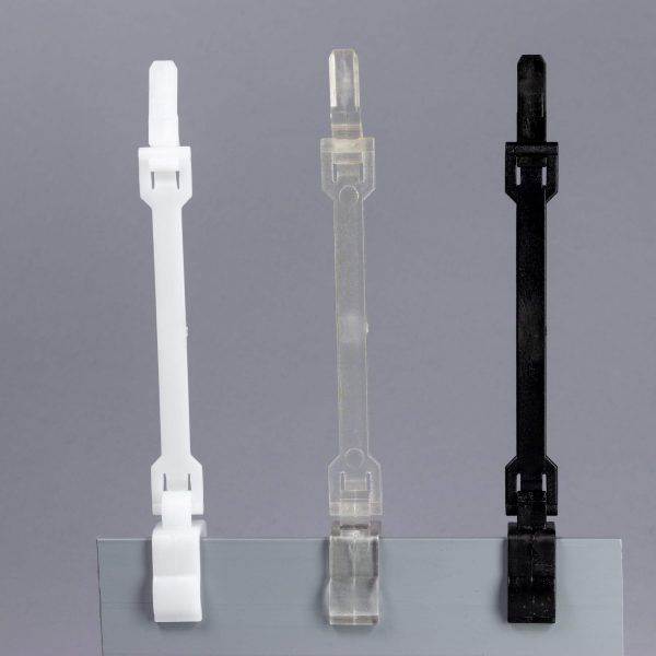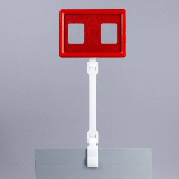 Držač za cene ram A8 sa malim R osloncem pogodan je za kačenje na gajbe, posude, tacne i ogradice debljine od 1 do 15mm. Zglobna veza omogućuje podešavanje nagiba držača. Mali R oslonac sa distancerom od 10cm omogućuje isticanje cena kod viših ili stepenasto slaganih proizvoda.