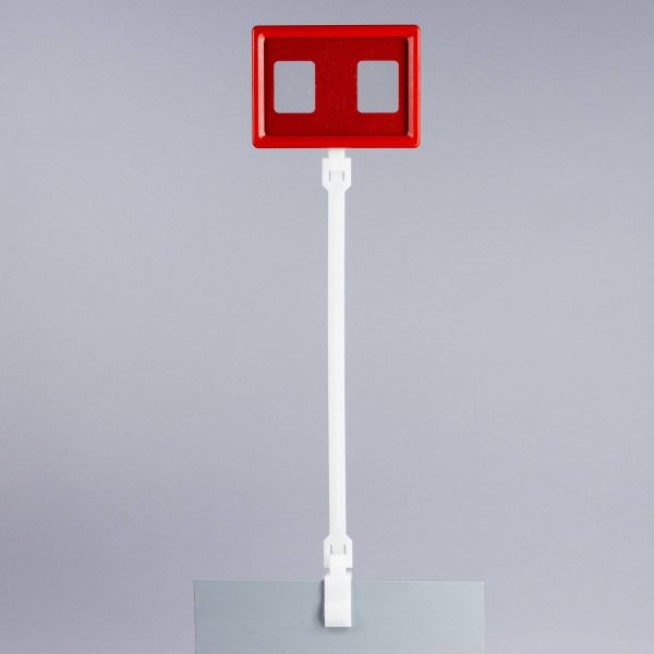Držač za cene ram A8 sa malim R osloncem pogodan je za kačenje na gajbe, posude, tacne i ogradice debljine od 1 do 15mm. Zglobna veza omogućuje podešavanje nagiba držača. Mali R oslonac sa distancerom od 20cm omogućuje isticanje cena kod viših ili stepenasto slaganih proizvoda.