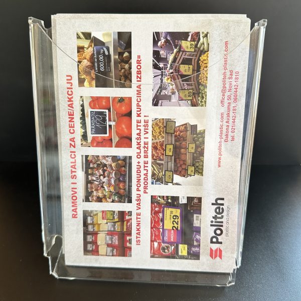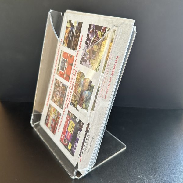 Kliritni stoni džep za brošure 1 izrađen je od visokokvalitetnog klirita deblljine 3mm . Ovaj stalak pogodan je za isticanje kataloga, flajera, cenovnika i drugih vrsta reklamno-informativnog materijala A4 formata.