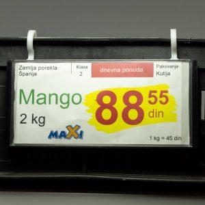 Držač za cene ram A4/3 se koristi za isticanje cena i akcija na policama, gajbama ili na samoj robi. Papir sa željenom informacijom se stavlja u duplo savijenu antirefleks providnu foliju i potom uvlači u ram. Format papira koji se stavlja u duplosavijenu antirefleks foliju je trećina A4 formata (210x99mm). Informacija se može ispisati kreda flomasterima na crnoj foliji.