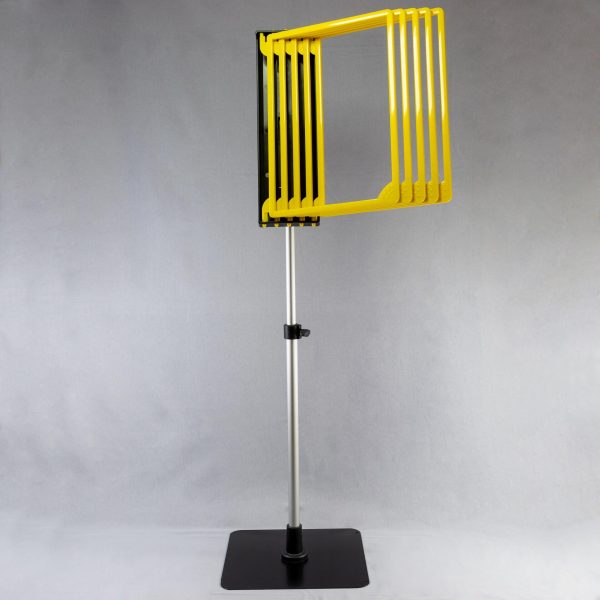 Stalak teleskopski sa pet okretnih ramova (lepeza) čine metalna stopa (25x25cm) crno plastificirana i centralno oslonjena, aluminijumska teleskopska cev podesiva od 45-75cm na koju je zglobno povezan plastični držač za 5 okretnih ramova A4.